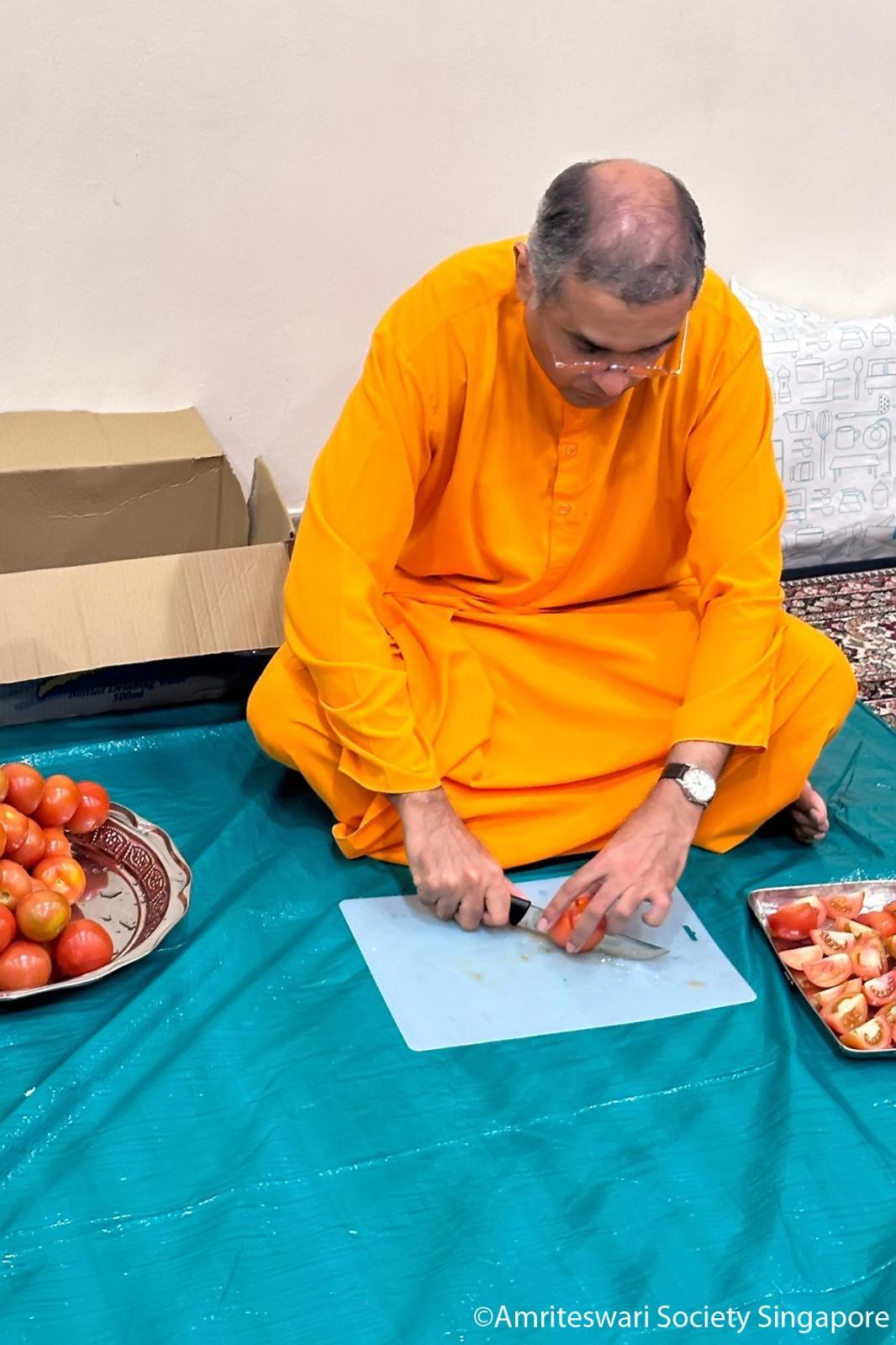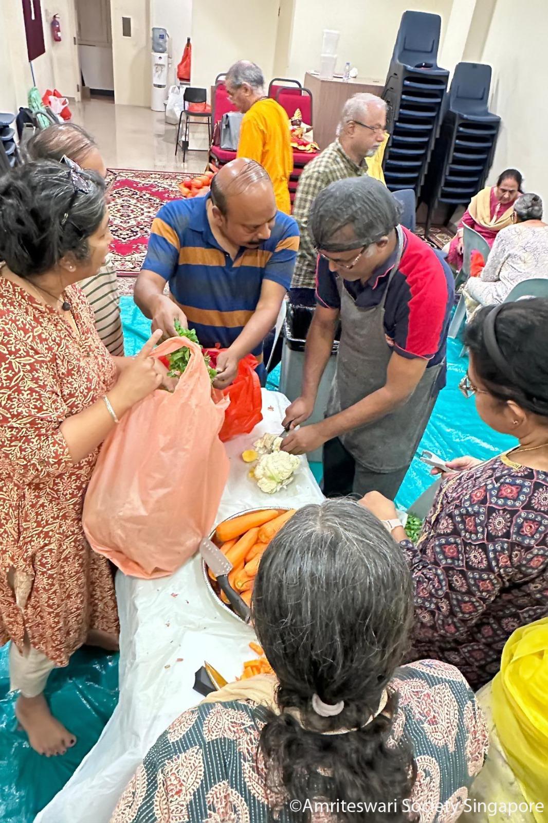 The sēvā activities for Mother’s Kitchen October 2024 started on the eve of Dīpāvalī, when devotees converged at the Centre to chop vegetables. About an hour before, staff from All India delivered sacks of vegetables—including beans, carrots, cauliflowers, potatoes, green peas, soya chunks, tomatoes, mint and coriander leaves. A tarpaulin sheet was spread over the carpets on level one; cutting boards, scrapers and knives were passed to the devotees, who then began scraping and dicing the vegetables for lunch the next day. The lunch—comprising vegetable biriyani, raita and kesari—were meant not for the devotees coming to the Centre but the needy in a neighbouring locale.