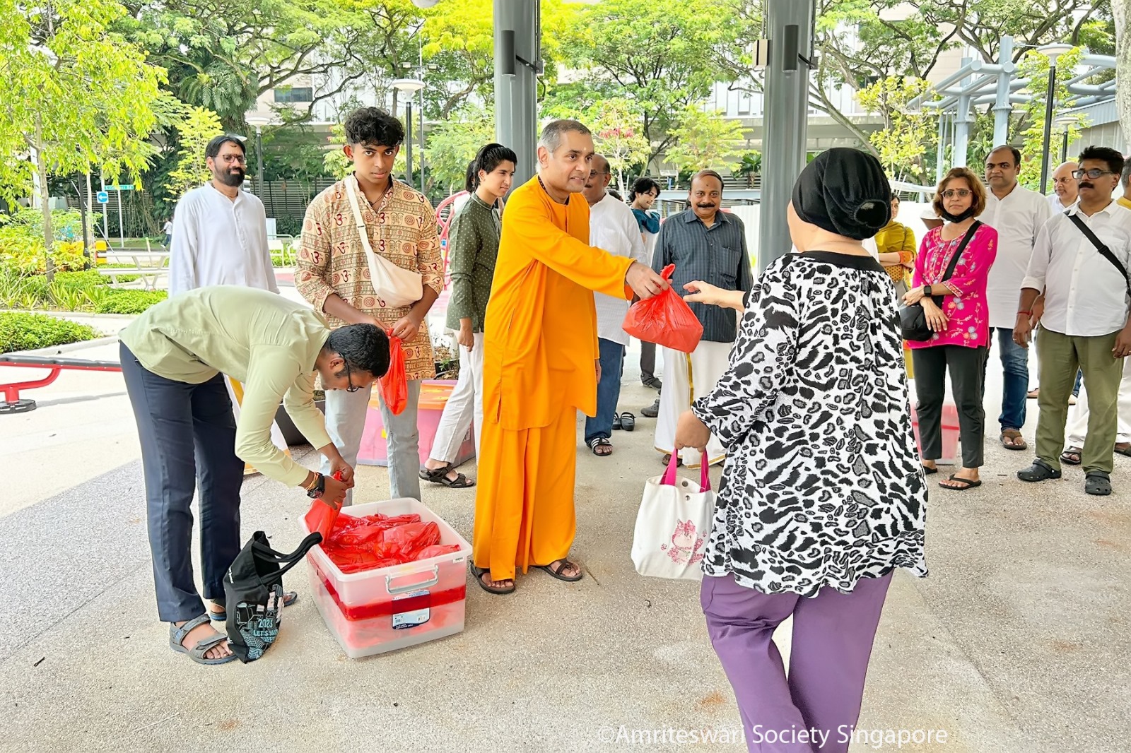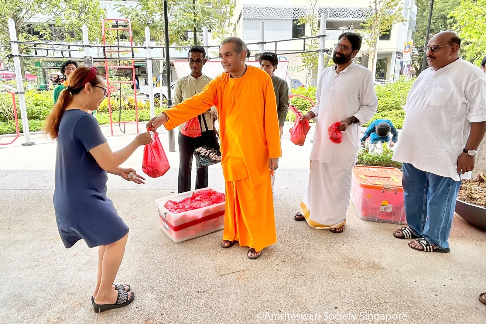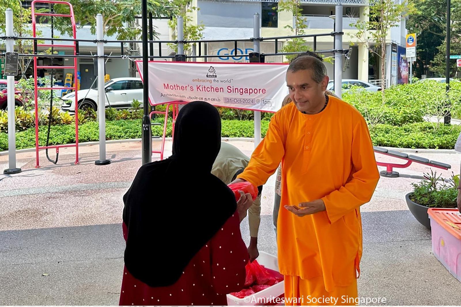 Devotees tied the banner announcing Amriteswari Society’s Mother’s Kitchen activity at the pavilion, and began distributing. Before long, many residents from blocks 1 and 2 made a beeline for the food distribution. Volunteers and staff of the KKCSC helped to spread the word, and even passing migrant workers came forward eagerly to receive their Dīpāvalī lunch. As each packet of food was given out, devotees from Amriteswari Society chimed, “Happy Dīpāvalī!” The beneficiaries reciprocated with warm greetings and expressions of gratitude.