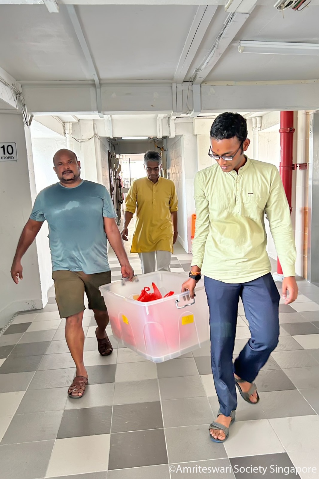In between distributing food packets, devotees learnt from the staff of KKCSC that there are needy, elderly people living in other nearby flats who are immobile. The devotees decided to carry food packets to them. Devotees formed smaller teams of about three of four, and the staff from KKCSC led them to the flats.