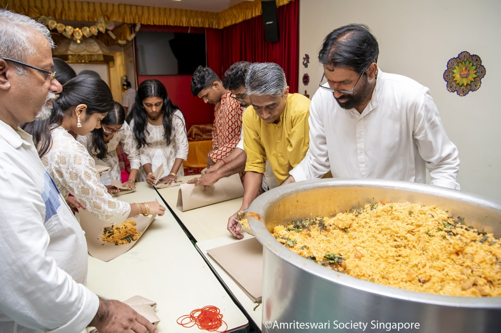 The next day, after the morning satsaṅg and Dīpāvalī brunch, more than 40 members began packing the cooked food. They were divided into four teams: one to pack the veg. biriyani in brown, wax paper; another to pack the raita into small plastic containers; a third to pack the kesari; and a fourth, to put these three packs into a separate bag for distribution.