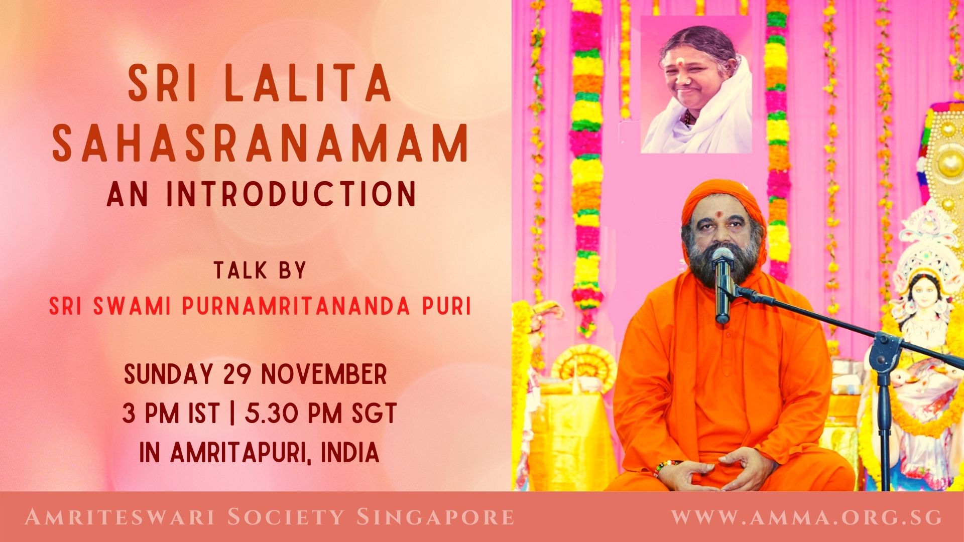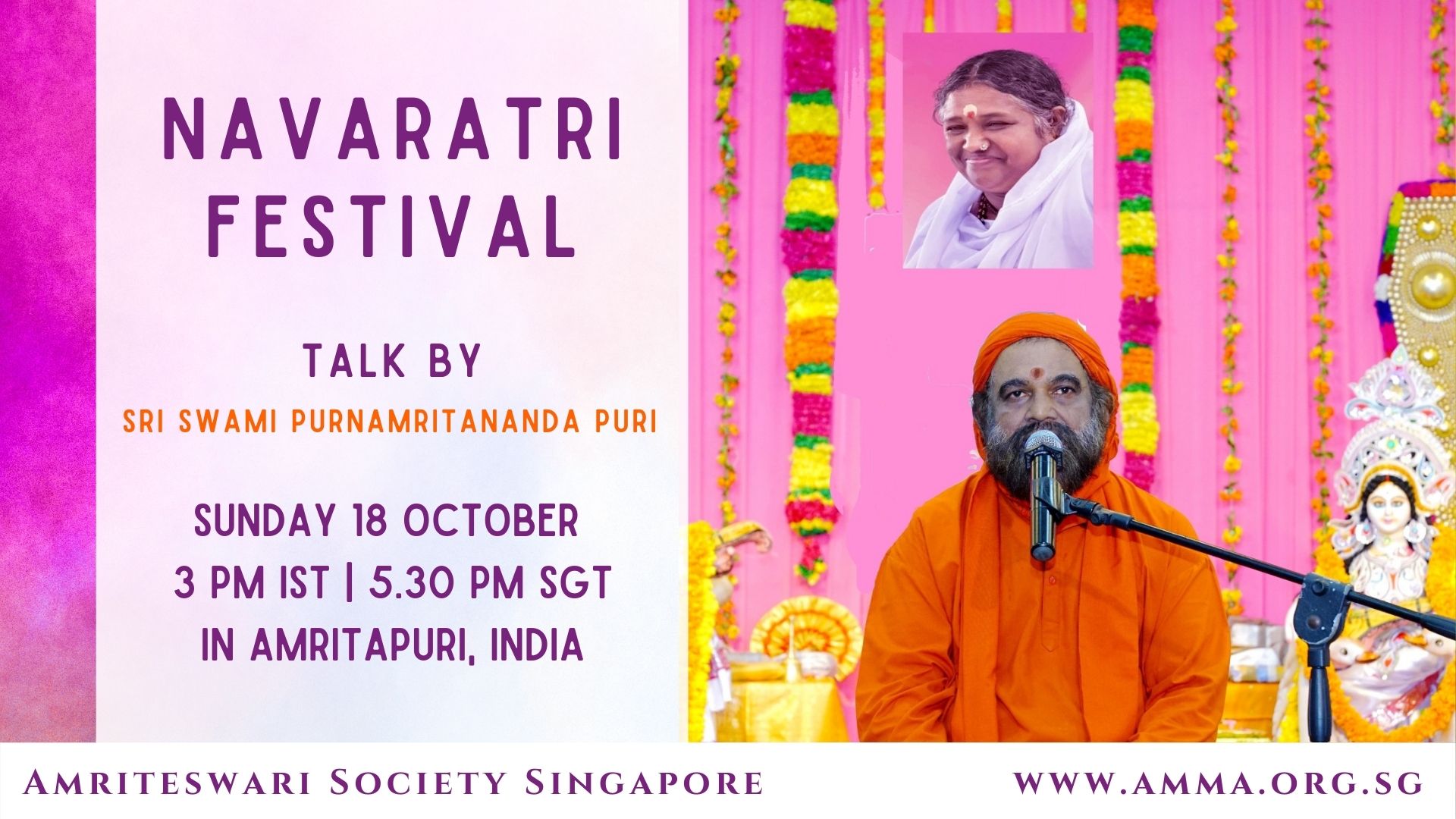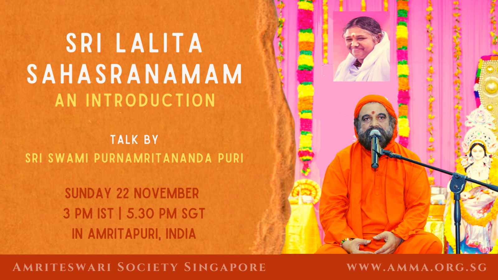 A talk by Br Madhavamrita Chaitanya *Om Namah Shivaya* We warmly invite you to a very special online talk by Br. Madhavamrita Chaitanya on Sunday, September 22nd, at 7 p.m. (Singapore time). The talk is titled: “Amma in My Life” This talk holds even greater significance as it will be given on Amma’s birthstar day, […]
